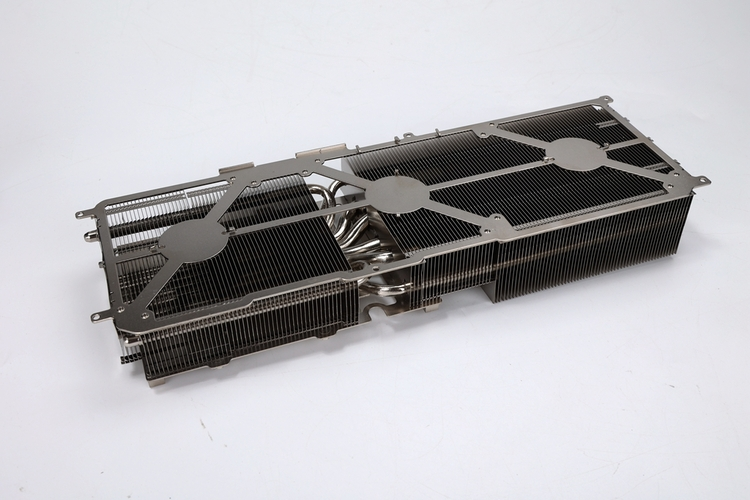 显卡背板:全金属加固背板进行了大面积镂空,以求减少尾部重量并兼顾最佳散热风道,使其足以应付运行过程中庞大热量;显卡背板中间采用拉丝工艺,展现不同的金属质感。