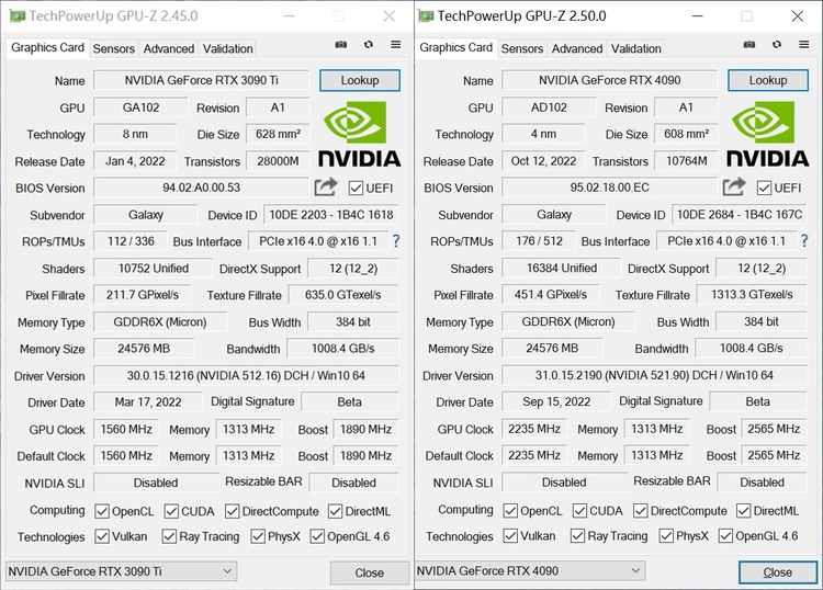 (左侧为影驰 RTX3090Ti 星曜 OC,右侧为影驰 RTX4090 金属大师 OC)