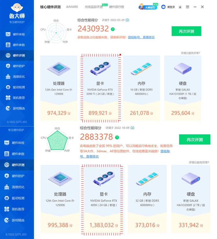 新版鲁大师测试中,显卡得分为1383032分,对比RTX3090Ti大幅领先。