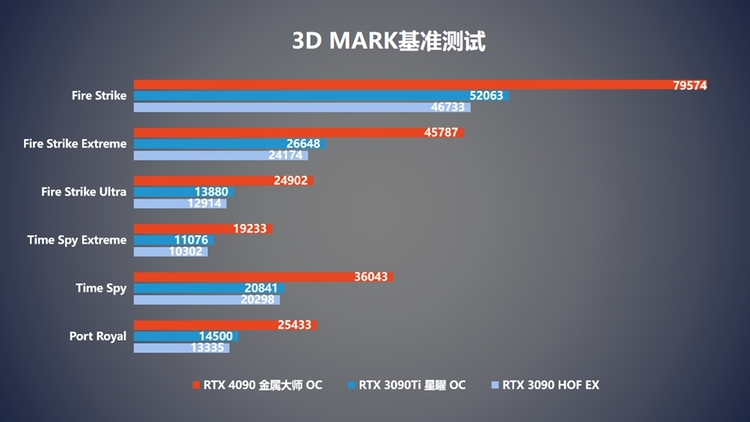 3DMark的测试项目包括FireStrike、FireStrike Extreme、FireStrike Ultra、TimeSpy、TimeSpy Extreme以及PortRoyal六个项目。其中FireStrike、FireStrike Extreme、FireStrike Ultra三个项目分别测试的是显卡在DX11游戏中的1080p分辨率、2K分辨率和4K分辨率下的性能指数,TimeSpy、TimeSpy Extreme两个项目则是显卡在DX12游戏中的2K分辨率和4K分辨率下的性能指数,PortRoyal是测试的显卡实时光线追踪的性能指数,具体得分如下: