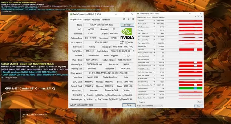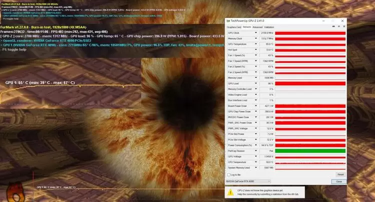 显卡占用率拉满的情况下,Furmark拷机超过十分钟,显卡频率稳定在2700MHz以上,温度稳定在67℃,显卡整体功耗在430W左右。