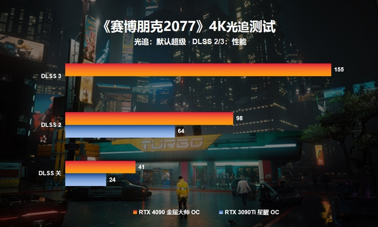 DLSS3开启后,《赛博朋克2077》在4K预设最高光追游戏环境下,平均帧数高达155帧!游戏版本为支持DLSS3的测试版本,即将在不久后正式上线;需注意的是,在《赛博朋克2077》中开启DLSS3目前需要同时开启DLSS和“帧生成”选项,Windows10以下版本系统需打开系统设置-显示设置中的“GPU”加速选项,Windows11系统默认开启该选项。