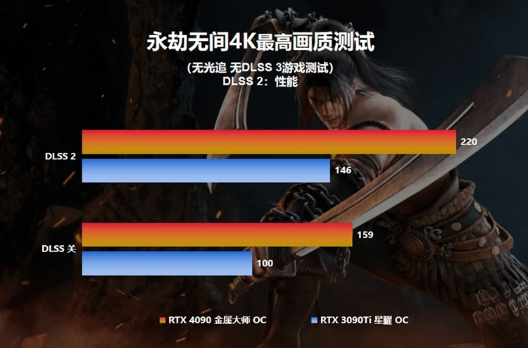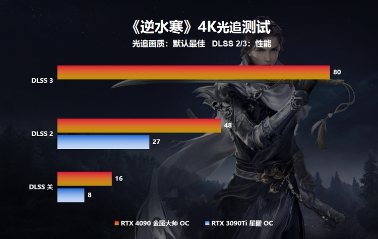 无光追和DLSS3游戏选测了大型多人在线游戏《永劫无间》,在不开DLSS的情况下,影驰RTX4090 金属大师OC也能在4K最高画质环境下,一分钟内平均帧数稳定100帧;《永劫无间》后续也将会支持DLSS3。