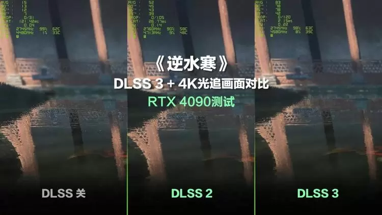 在《逆水寒》4K光追测试演示中,DLSS3开启后画质并没有下降,反而让贴图的锯齿更加平滑,栏杆在水中的倒影更加清晰,看上去细腻真实,对比DLSS2也有将近一倍的帧数提升。