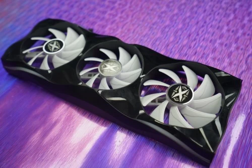耕升 GeForce RTX®4090 炫光 OC采用全新升级的第二代「炫之黑曜石」散热器。支持ARGB可调灯效,也支持连接市面上主流主板的神光同步。第二代「炫之黑曜石」散热器不仅升级了外观和灯效设计,还升级优化耕升专用的「炫风之刃」扇叶。由2个102mm和1个92mm组合而成的三风扇,经过升级后能提升风流量的同时减低声噪,更高速有效地散热,轻松应对高达600W TGP 功耗下的温度。