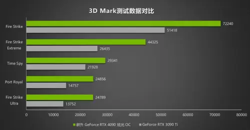 首先使用3DMark软件来进行GPU各项基准测试。从测试结果上来看,耕升GeForce RTX 4090 炫光 OC GPU较于RTX 3090 Ti有明显的性能提升:Fire Strike提升了40%,Fire Strike Extreme提升了68%,Time Spy提升了34%,Port Royal光追测试中提升了68%,Fire Strike Ultra提升了80%。这得益于 耕升 GeForce RTX 4090 炫光 OC采用了全新Ada架构和光流加速器,能使GPU性能和光追性能得到进一步大幅度提升。