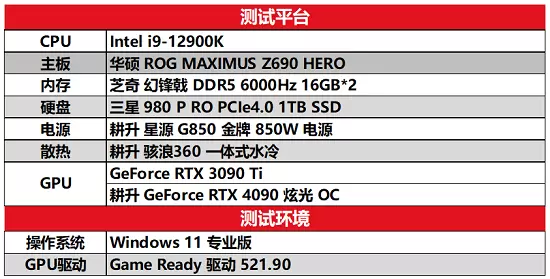 正式进入测试环节,为了不让测试平台限制GPU本身的性能,故本次测试平台处理器采用英特尔酷睿i9-12900K搭配 华硕 ROG MAXIMUS Z690 HERO主板;内存采用 芝奇 幻锋戟 DDR5 6000Hz 16GB*2;电源采用的是 耕升 星源 G850金牌 850W,搭配 耕升 骇浪360 一体式水冷,能最大程度为GPU降温。这套配置足以让耕升 GeForce RTX 4090 炫光 OC GPU能在稳定的环境下最大程度发挥出超强性能。