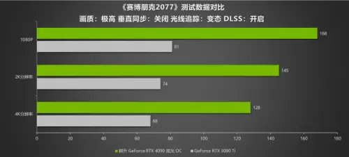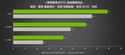 本次测试的游戏为《赛博朋克2077》,并开启最新的DLSS 3 质量模式。从测试结果可以看出,较上一代旗舰GeForce RTX 3090 Ti,GeForce RTX 4090有着明显的性能提升,尤其是在开启DLSS 3 质量模式的情况下,能有2倍以上的帧数提升。在开启DLSS和极致光追后,4K分辨率能跑到128帧的平均帧数,画面流畅不卡顿,光追效果令人惊叹,而且还可以达到完美运行游戏的标准。