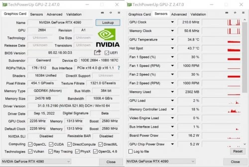由检测软件GPU-Z可看到升 GeForce RTX 4090 炫光 OC的产品规格和基本参数,以及其待机温度为34.8°C,功耗为16.2W。