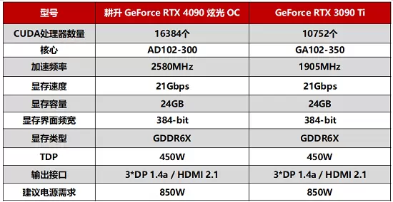 耕升 GeForce RTX 4090 炫光 OC与GeForce RTX 3090 Ti 相比,CUDA处理器数量增加至16384个,加速频率增加至2580MHz,显存速度保持21Gbps。24GB大显存的设计能让玩家和设计师们在处理复杂的游戏场景和办公环境中得心应手。而且全新Ada Lovelace架构带来高强性能,效能较上一代旗舰大幅提升。最新一代DLSS 3的应用也能让游戏和渲染展现出超强的性能体验。