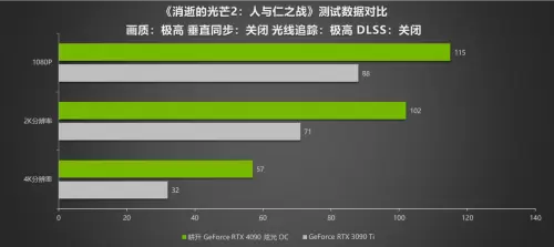 在光追游戏《消逝的光芒2:人与仁之战》中,GeForce RTX 4090 依然有不俗的表现:在极限画质下开启DLSS 3 质量模式后,1080P能跑到140帧,2K分辨率能跑到128帧,4K分辨率能跑到118帧,相较于GeForce RTX 3090 Ti有30%~55%的性能提升。这个帧数对于第一人称游戏来说也可以达到完美游戏的标准,能很好地满足各玩家不同的需求。