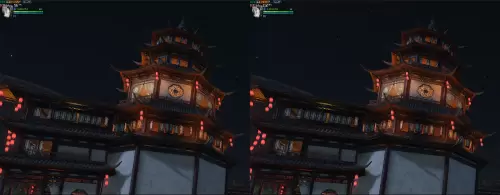 从测试结果可以看出,在极限画质、关闭DLSS的情况下,两个GPU在三种分辨率下的差别其实并不大,而当开启DLSS 3后,帧数才有了明显的变化。在4K分辨率下,RTX 4090能跑到117帧甚至更高,而RTX 3090则只能跑到67帧。由于40系显卡支持DLSS 3的缘故,使得RTX 4090的帧数比RTX 3090 高80%左右,而且从画面可以看出,开启DLSS 3 后不仅帧数上升,而且游戏内的阁楼上花纹锐化,图形更为清晰,场景细节更加突出。