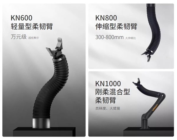 万勋基于在行业服务领域的多年积累,面向不同作业场景推出了三个系列的Nimbo™柔韧臂首发阵容:KN600系列轻量型柔韧臂,20肌肉,7柔韧自由度冗余构型,面向任意安装方式的轻量化通用移动式作业和仿人服务式作业;KN800系列伸缩型柔韧臂,21肌肉,3柔韧自由度可伸缩构型,面向吊装式作业,实现狭小空间、大伸缩比的大负载灵巧作业,适用于飞行平台、高低空作业平台和轨道式机器人平台作业;KN1000系列刚柔混合型柔韧臂,8肌肉3电机,3柔3刚自由度混合构型,面向任意安装方式的大臂展柔韧作业,实现大空间、高精度、高速度柔性运动,适用于移动式或固定式平台搭载的巡检、操作、柔性处置与搬运等多行业多场景作业应用。