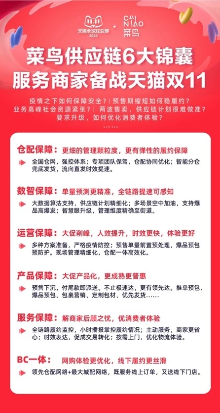 菜鸟供应链公布的双11大促保障方案显示,目前其已从仓网、数智、产品、运营、服务、BC一体等6大方面给出相应举措。