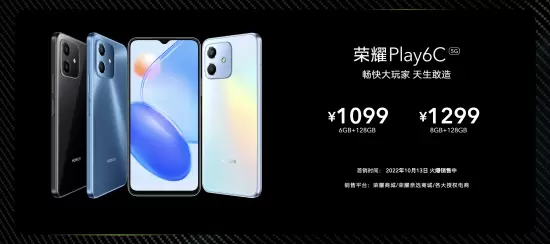 荣耀Play6C售价1099元起,10月13日10:08已在荣耀商城、荣耀亲选商城和各大授权电商平台正式开售。