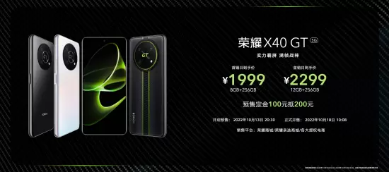 目前,荣耀X40 GT已开启预约:8GB+256GB版本首销到手价1999元、12GB+256GB版本首销到手价2299元,10月13日20:30正式预售,10月18日10:08开售。
