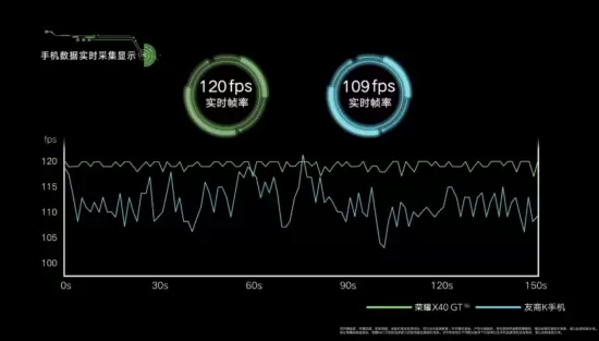 荣耀X40 GT搭载了最新的GPU Turbo X技术,通过系统底层调优,游戏过程中的帧率表现更为稳定,GPU渲染性能大幅提升30%,重载游戏功耗下降6%。在主流120帧MOBA游戏实测中,荣耀X40 GT实现了持续满帧;在4小时主流90帧吃鸡游戏极限测试中,荣耀X40 GT更是做到了98%以上的满帧时刻;而针对重载RPG游戏测试,荣耀X40 GT也比同档位手机平均帧率高出了6帧。