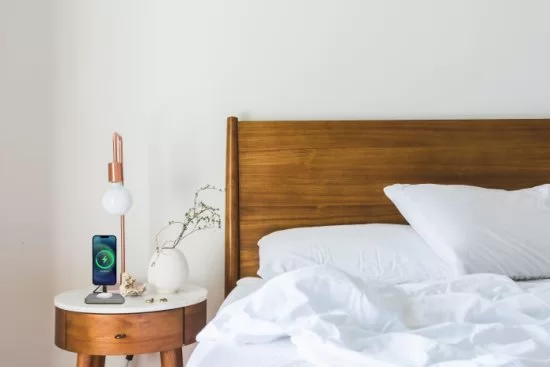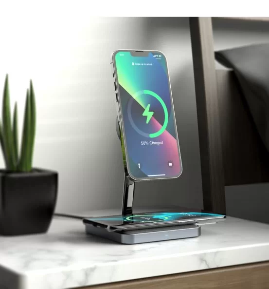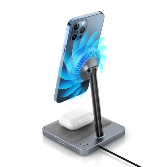 这款颇具未来感的支架式无线充电器不仅通过了苹果的MFM(Made For MagSafe) 认证,拥有堪比原厂的15W功率,它最大的亮点还在于彻底改变了MagSafe无线充使用时温升速度快导致的充电功率下降——充电速度慢的问题。