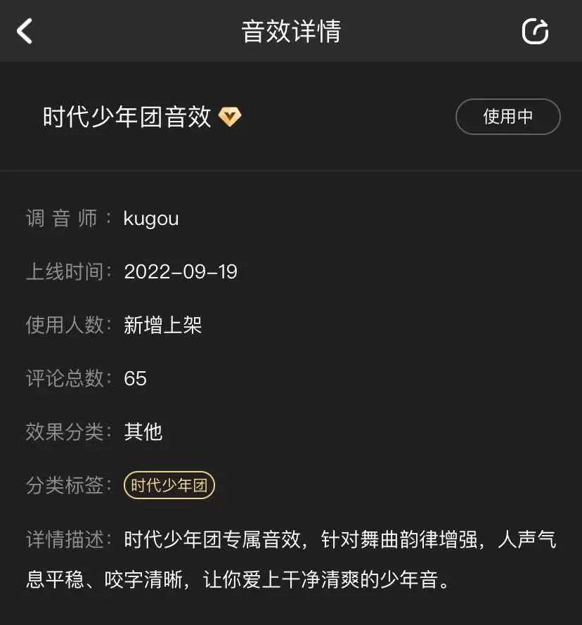用本次新增上架的时代少年团音效举例,酷狗蝰蛇音效首先针对时代少年团的歌曲做了特殊处理,首先拉近音源,针对舞曲韵律增强,让歌迷仿佛置身在舞台中央,闭上眼就能感受到几位元气少年在耳边吟唱。酷狗蝰蛇音效还对少年们的人声进行特殊处理,让歌迷在少年们气息平稳、咬字清晰的歌曲中爱上干净清爽的少年音。