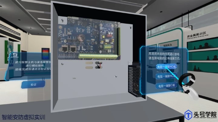 通过虚拟仿真技术模拟各类安防设备安装环境,根据教学特点设置不同品牌、类型的安防设备,进行虚拟环境下的安装、连线和调试,弥补实体实训固有缺陷带来的不足,实现虚拟实训与实体实训的结合;主要包括博物馆、银行、车站、小区、校园等虚拟环境,集成不同品牌入侵报警设备、视频监控设备、门禁设备。实现不同场景下设备安装、接线与调试的直观形象展现与虚拟操作,能够让相关专业学生、参观者进行全面细致的学习。