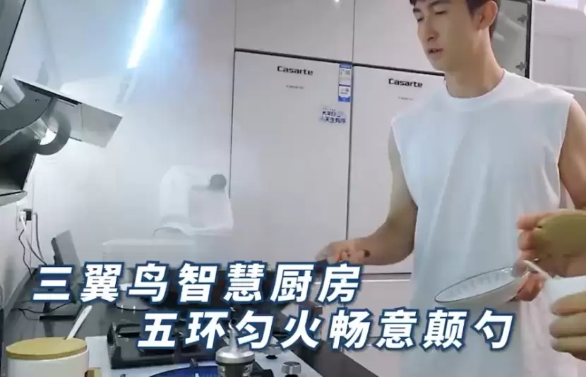 而在三翼鸟厨房,这些问题就可以解决。传统厨房给用户提供的,大都是由一个个家电拼凑出来的空间,不会聚焦用户真正生活下的“使用场景”,所以人们做起早餐来又赶时间又犯愁。而在三翼鸟厨房,不光橱柜和家电完美嵌入,就连整个吃、买、存、做、洗的生活动线也清晰明朗。就像节目中武大靖从冰箱里拿出虾仁,并没有冻成冰坨,肉质依然鲜美;炒菜时,点燃灶台的一瞬间,油烟机就随之联动开启,保障无烟烹饪环境。
