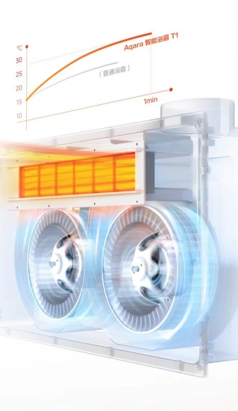 Aqara 智能浴霸 T1配备双直流变频电机,拥有2800W PTC陶瓷制热。顷刻间暖流充满整个浴室,1分钟立享受暖浴。