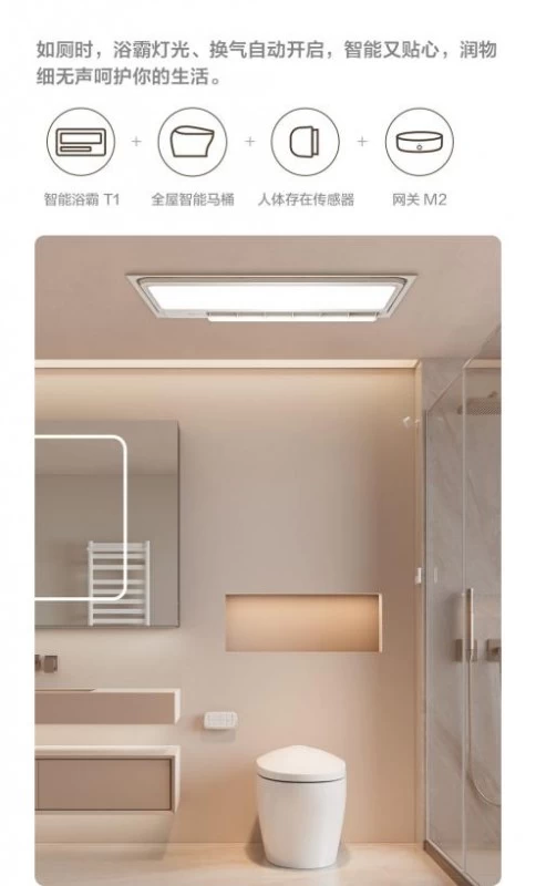 如厕时,灯光、浴霸换气自动开启,智能又贴心,润物细无声呵护你的生活。