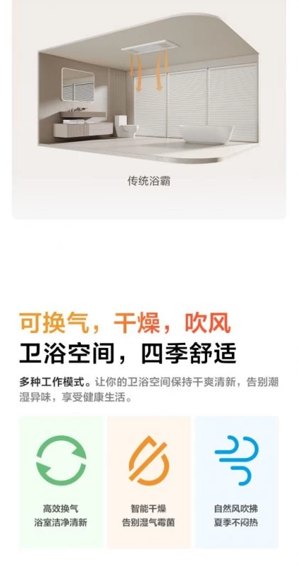 Aqara 智能浴霸 T1 拥有换气、干燥、吹风多种工作模式,让你的卫浴空间保持干爽清新,告别潮湿异味。