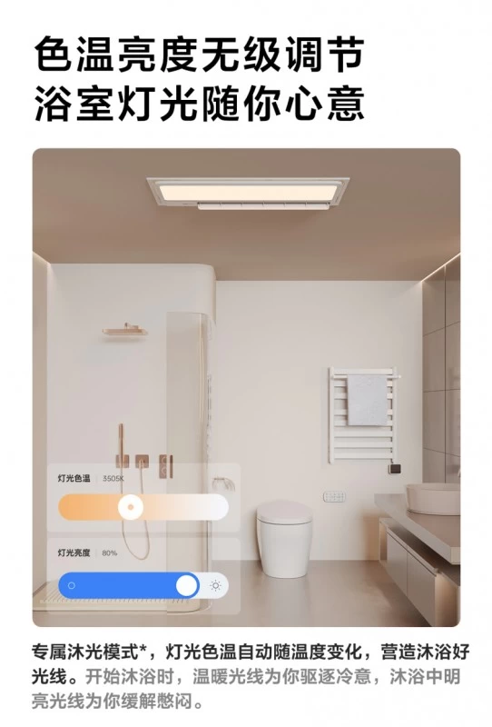 Aqara 智能浴霸 T1 拥有专属沐光模式,灯光色温自动随温度变化,营造沐浴好光线。刚开始沐浴,温暖光线驱逐寒意,沐浴中明亮光线缓解憋闷。