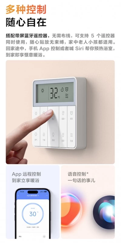 Aqara 智能浴霸 T1 搭配带屏蓝牙遥控,无需布线,随时随地都能使用。同时还支持手机App 控制或者Siri 语音控制。