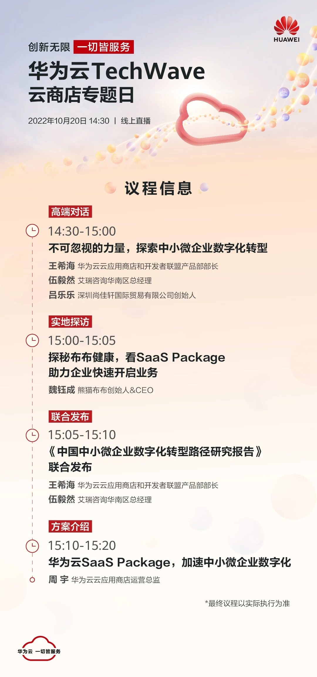 独家大咖观点、最前瞻的行业趋势和企业数字化转型分享、华为云SaaS Package全面解读…10月20日华为云TechWave云商店专题日,全是干货,不容错过。