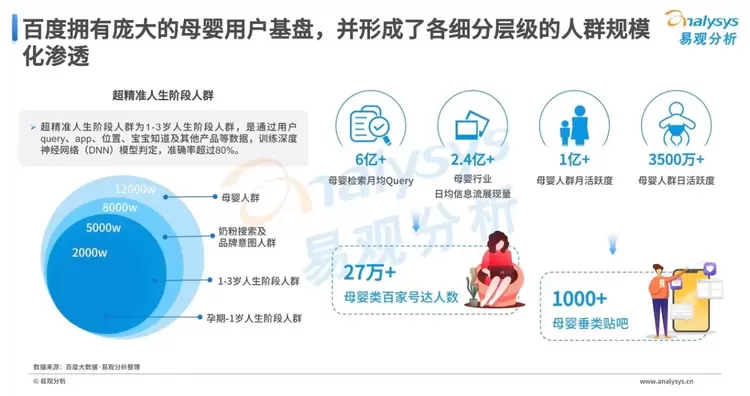 随着新一代宝妈宝爸文化水平与经济实力的提升,母婴市场需要全方位的生态平台,一站式满足用户知识学习、工具获取、社交分享与消费种草的进阶需求。而百度不仅拥有庞大的母婴用户基盘,同时通过丰富的母婴内容生产及沉淀,实现母婴领域各细分层级的人群规模化渗透。