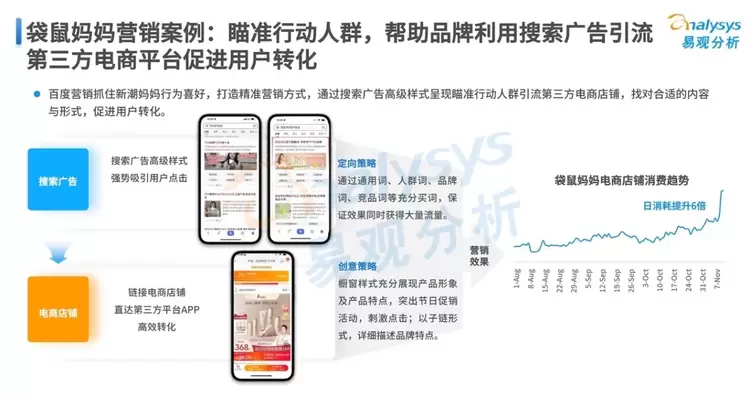 在效果转化方面,百度通过信息流产品精准投放,全方位帮助品牌提高营销转化能力,驱动品牌生意增长;在长效经营方面,百度营销基于百度平台全域流量,利用百度小程序及企业号构建品牌私域,与用户形成长效沟通。例如,通过对新潮妈妈行为喜好的分析,百度帮助袋鼠妈妈瞄准目标人群,引流到其第三方电商商铺,最终促成其电商店铺日消耗提升6倍的经营转化。