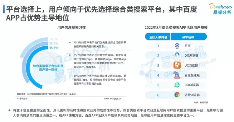 消费观的转变,推动母婴品类需求向精细化、专业化发展,消费人群更热衷在选购前“做好功课”。得益于信息覆盖的全面性、资讯更新的及时性和搜索业务的成熟型等优势,综合类搜索平台依旧是互联网用户搜索信息的主要平台,百度APP凭借活跃用户规模优势,成为母婴用户信息搜索的主要平台之一。