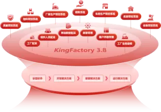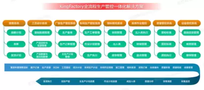 KingFactory由工艺设计系统、销售系统、厂级生产管控系统、物料管控系统、库房管控系统、车间生产管控系统、质量管控系统、设备管控系统、能源管控系统等九大业务子系统组成。具有覆盖销售订单、产品工艺设计、生产排产排程、物料、库房、车间、质量、设备、能源的全业务流程的生产管控一体化解决方案。