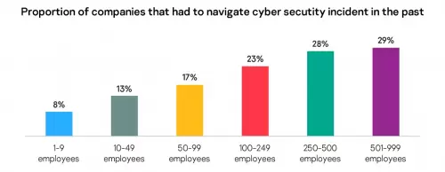 IT安全担忧并非毫无根据,特别是考虑到随着公司的发展,面临网络安全相关问题的可能性会增加。拥有1至8名员工的组织中,虽然只有8%表示他们会面临IT安全事件,但是在拥有501名以上员工的企业中,这一比例增加到30%。