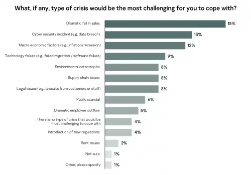 为了深入了解哪些危机会给中小型企业带来最大风险,卡巴斯基采访了来自全球13个国家拥有1至999名员工的公司的决策者[1]。尽管汇总数据显示,网络安全事件是第二大危机类型,仅次于销售额大幅下降,但代表中型情况也(50-999名员工)的受访者认为这两种类型的危机同样复杂。对中小型企业来说,租金问题和新法规的引入似乎挑战性最小。