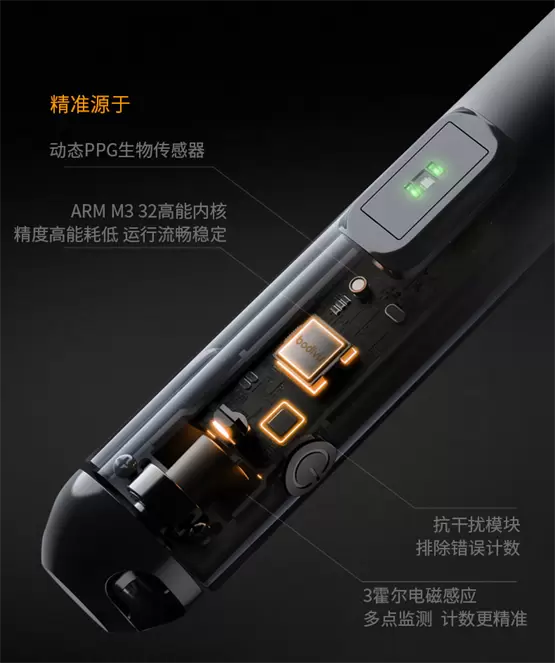 在搭载芯片方面,同方健康采用内置ARM M3 32位高性能内核的定制芯片,具备程序运行效率高、可连接丰富外设、稳定性强等诸多优势;3个霍尔电磁感应,多点检测,也使得测量精度大幅提升、动作捕捉更为精准;在心率模块,定制芯片具备较强抗干扰性,能够有效保障心率监测结果的准确程度。