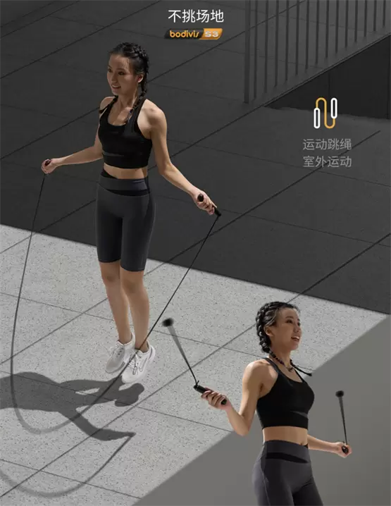 此外,S3好体知跳绳还配置了无绳和有绳两种绳型选择,用户可根据不同场景随心切换。其中,无绳跳绳既能营造出传统跳绳运动时的甩绳感觉,也能避免长绳容易触碰身体等情况,打破空间限制,疫情居家人群亦可在室内运动,真正做到室外有绳惬意跳、室内无绳轻巧跳。