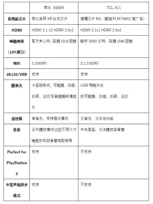 首先我们看一下索尼X95EK和TCL X11的基本硬件参数: