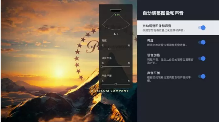 ·当观看者集中在某一侧或者均匀分布的话,它会根据观众的位置调整声音的平衡。屏幕上摄像头示意图中的小绿点会根据识别出来的人数而变化,而声音平衡会根据观众所在位置进行偏移调整,来适应观众的最佳听音感受;