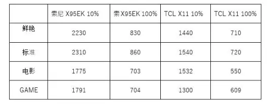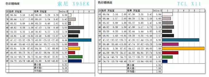 在电影模式下测得:索尼X95EK色准平均值为2.09,TCL X10色准平均值为2.96,两台电视色准表现都很优秀。