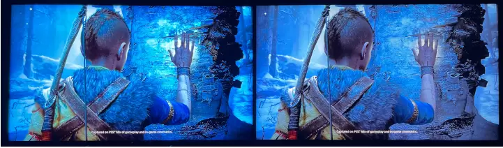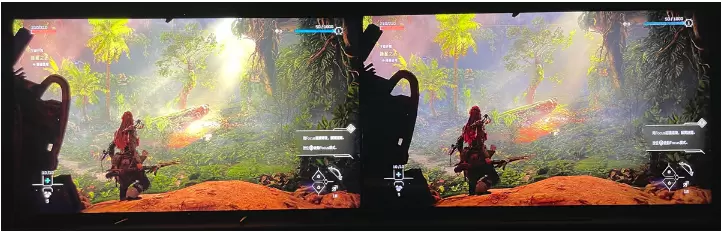 左索尼X95EK 右TCL X11,在《地平线》游戏的洞口画面中,洒下的阳光不是X11那样淡淡的,而是被遮挡后有不同亮度的光团的视觉效果,玩起来像是两个游戏