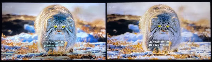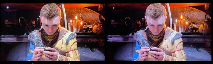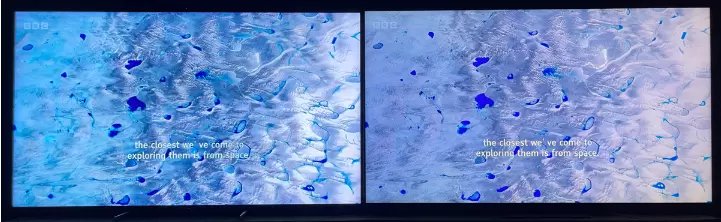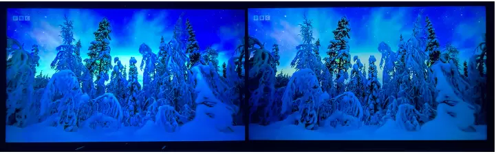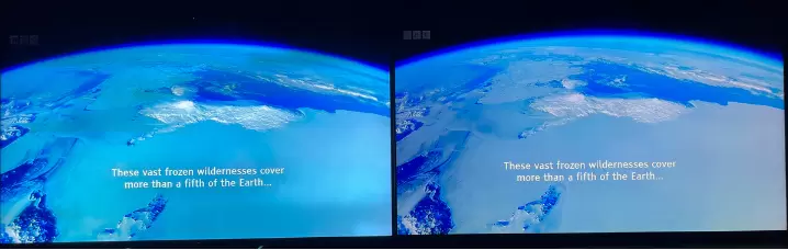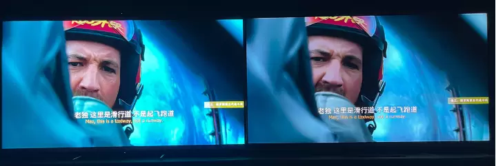 左索尼X95EK 右TCL X11,在X95EK上的人物边缘有淡淡的光晕,而TCL X11的黑位控制的十分稳定,但是这也跟X11的峰值亮度比X95EK低了不少有着明显关系,如果把X95EK调整到亮度较低的电影模式则可以大大改善光晕现象的出现。