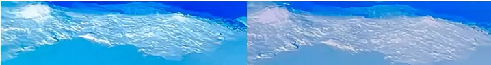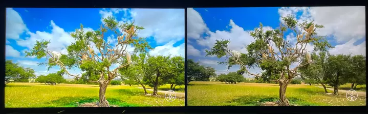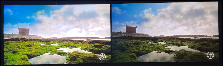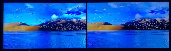左索尼X95EK 右TCL X11,湖面波光粼粼的感觉和远处云朵的层次感都凸显出来了,索尼在处理画面细节加强的经验上还是相当稳妥的