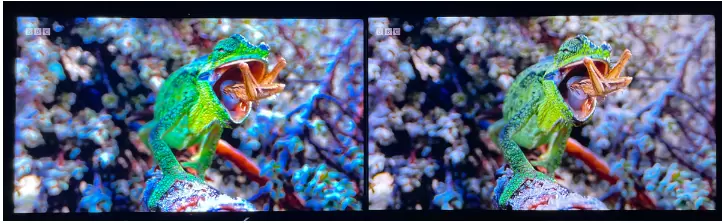 左索尼X95EK 右TCL X11,不管是前景蜥蜴还是背景岩石上的植被都是在索尼X95EK上有着更强烈的色彩,更真实。这得益于索尼XR认知芯片为用户带来与众不同的逼真体验。传统图像处理技术进行画质优化时,仅能对色彩、对比度、画面细节等元素进行单独检测、分析;而XR认知芯片则模拟的人脑的认知习惯,当我们观看物体时,视线会集中在一些聚焦点上,在认知智能的驱动下,XR认知芯片可以侦测到用户视线聚焦点在图像中所对应的位置,并对这些图像进行综合分析。索尼的XR动态背光系统大师版和XR对比度增强旗舰版技术让画面层次感更高,该黑的地方黑下去,该亮的地方亮起来,并且在黑位和高光的区域尽可能多的保留更多的画面细节。