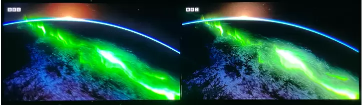 左索尼X95EK 右TCL X11,航拍极光和日出,使用仪器测得太阳光中心亮度分别是:X95EK为1545尼特,X11为998尼特,虽然单独看哪台电视都有不错的观感,但是一对比就会发现X95EK有更加接近真实的亮度爆发力