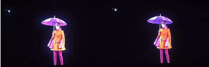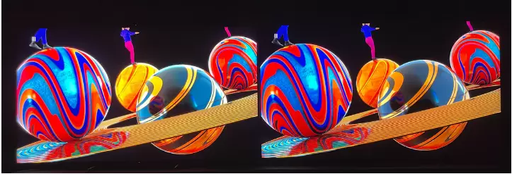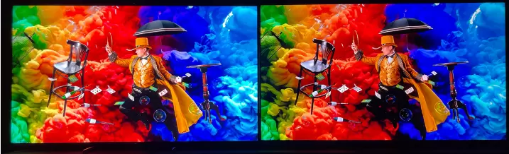 左索尼X95EK 右TCL X11,在这种高光和黑位大反差的画面中,索尼X95EK因为有着明显的高光区域亮度优势,对于一些视觉敏感的人可能会在高光区域的边缘出现一些光晕现象,如下图所示(拉长曝光时间后)纯黑区域尤其是在人物和彩色泡泡的轮廓边缘出看到一些轻微的灰白色,而不是其他黑色区域那种干干净净的纯黑,但这种情况一般也非常不明显,除非像这样的极限情况才可能会被人注意到,而下图的画面也仅是相机故意长曝光会拍下来,正常拍照和实际人眼观看并不会看到这么特别明显的光晕情况。
