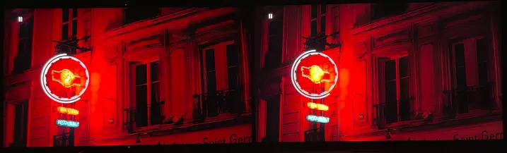 左索尼X95EK 右TCL X11,在考验对比度表现的画面中,X95EK展现了更多暗部细节,而TCL X11在霓虹灯的高光区域有更高的亮度表现。