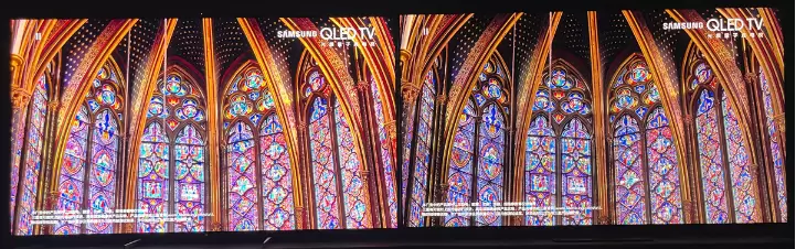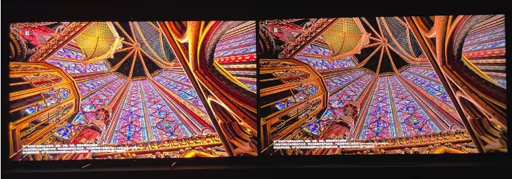 左索尼X95EK 右TCL X11,在索尼X95EK上教堂天棚整体平均亮度更高,柱子的色彩和亮度过渡的更均匀,层次和细节展现的更多一些
